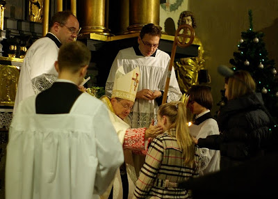 ¶ Finita Missa statim Vicarius assistens vadit ad deponendum super credentiam Pluviale, Abbas vero accepta mitra, et facta cum ea debita Cruci reverentia, simul cum Diacono et Subdiacono accedit ad faldistorium, ubi sedit, depositis prius manipulis a Ministris, suumque dimittit, iterum Clerici ponunt super Altare duos Agnos, floribus in capite coronatos, cum pelvino in cornu Evangelii et Epistolæ: Cantores cantant antiphonam sequentem ( Stans, etc.) : In eodem tempore Abbas cum mitra imponit ter incensum in thuribulo de more illud benedicens ; expleta Antiphona mitratus accedit ad altare cum Ministris, et ante ipsum, mitra deposita, facta reverentia Cruci in medium ascendit, ubi manibus iunctis in tono feriali, sive cantu, has præces et orationes dicit.